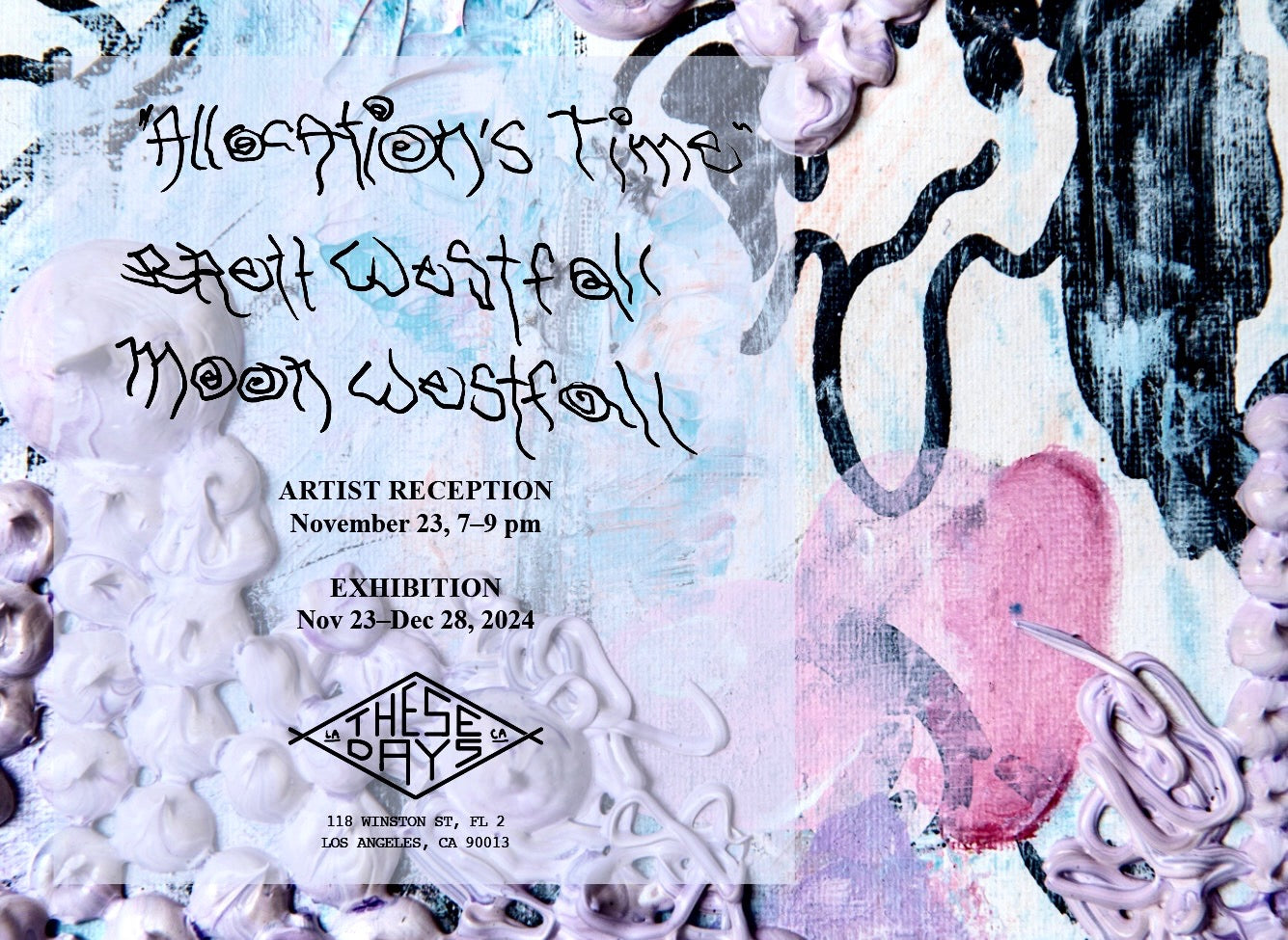 We are pleased to present Brett & Moon Westfall’s second show here at These Days, Allocation’s Time. For this exhibition, multidisciplinary artist Brett Westfall and his 15 year old daughter Moon, expand on their practice of collaborating on canvases to include sculpture, assemblage, and installation, endeavoring to create a total space. A recent turn-of-events forced both Westfalls’ to consider the frailty of our human form and how the trajectory of our lives can change at a moments notice, without warning. Accepting this realization has led them to consider how they spend their time and with whom. These considerations are the catalyst behind this newest exhibition, Allocation’s Time.