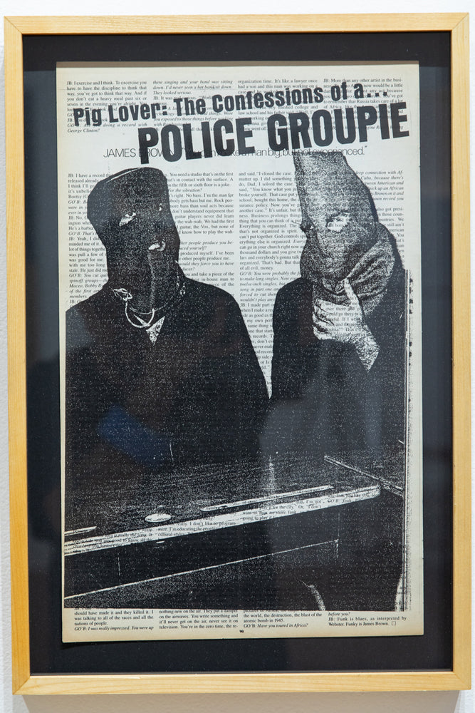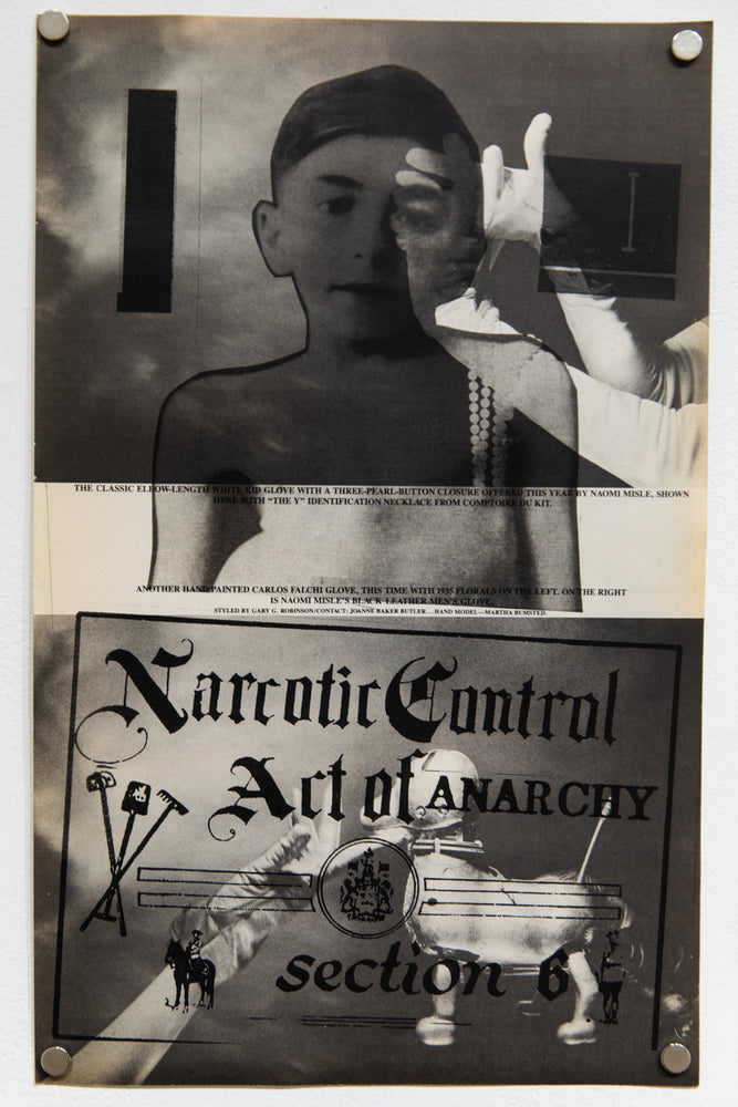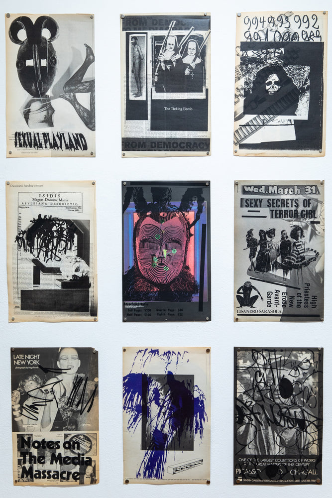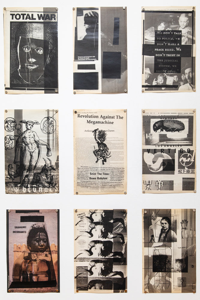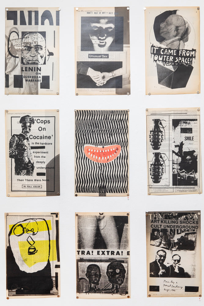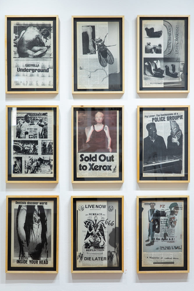 Using original, even collector's, back issues, TT reprints on the pages, in a sort of blast, other visuals from underground culture. In this way, he poses as iconographer as well as iconoclast. In a way he is inviting us into the hell of images. Superimpositions of meaning, random connections, a kind of programmatic madness. In these large-scale compositions, a new meaning is offered to us. From the bowels of his photocopiers, Tourmente invites us into a jig of analogous analogies, concretely we're looking at nothing but subliminal images. Through his obsessive gaze, he confronts the gravity of images and their lost meanings. Delirious with his Xerox, as if passed through a mental filter, the images become psychological once again. And beyond seduction, obsession slowly takes over. As we peruse these prints, these snippets of texts and slogans, visuals and graphics, photos and drawings, we are reminded that the power of images lies in the paradox that they are nothing, and yet within us, they create an inner world.