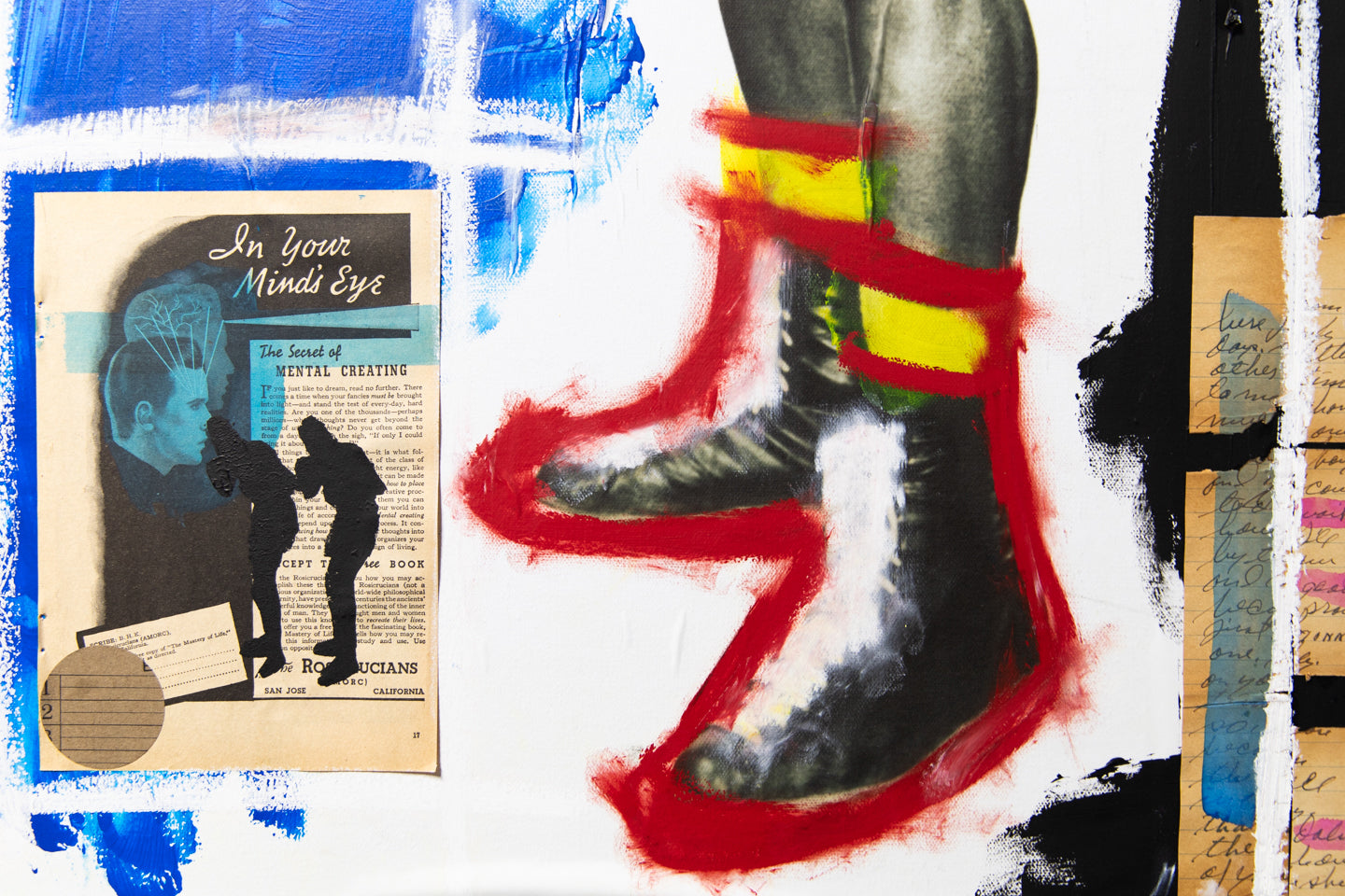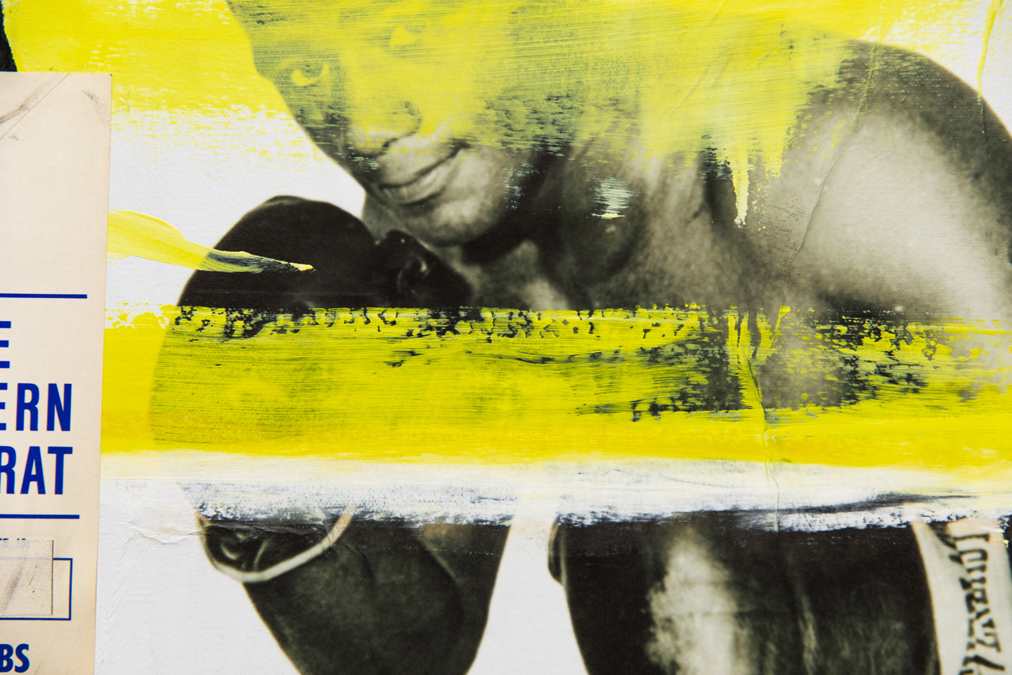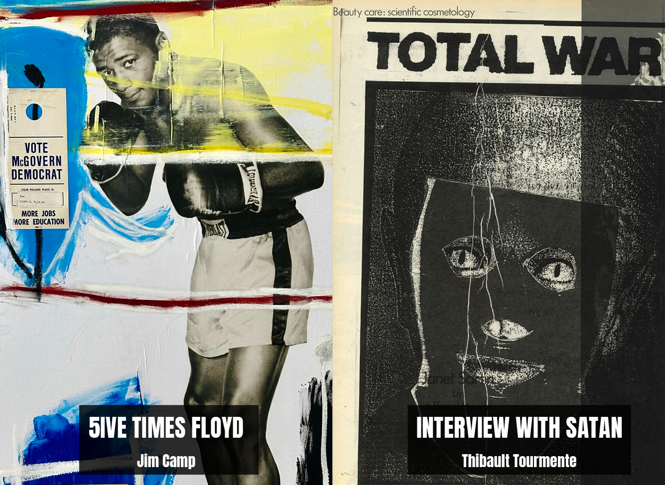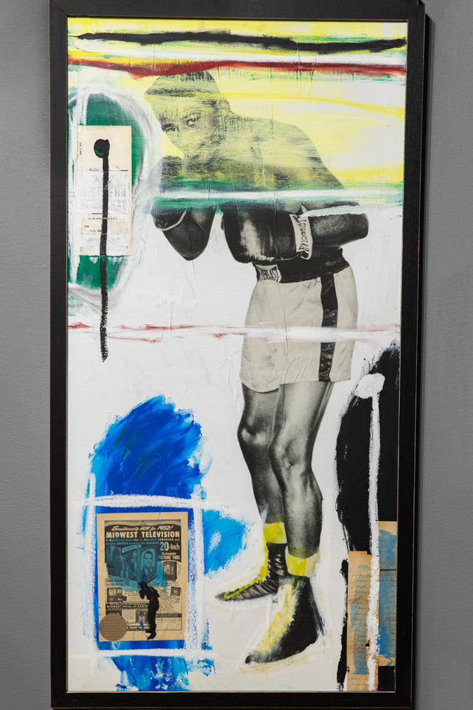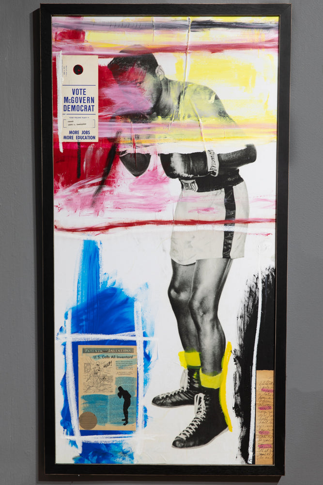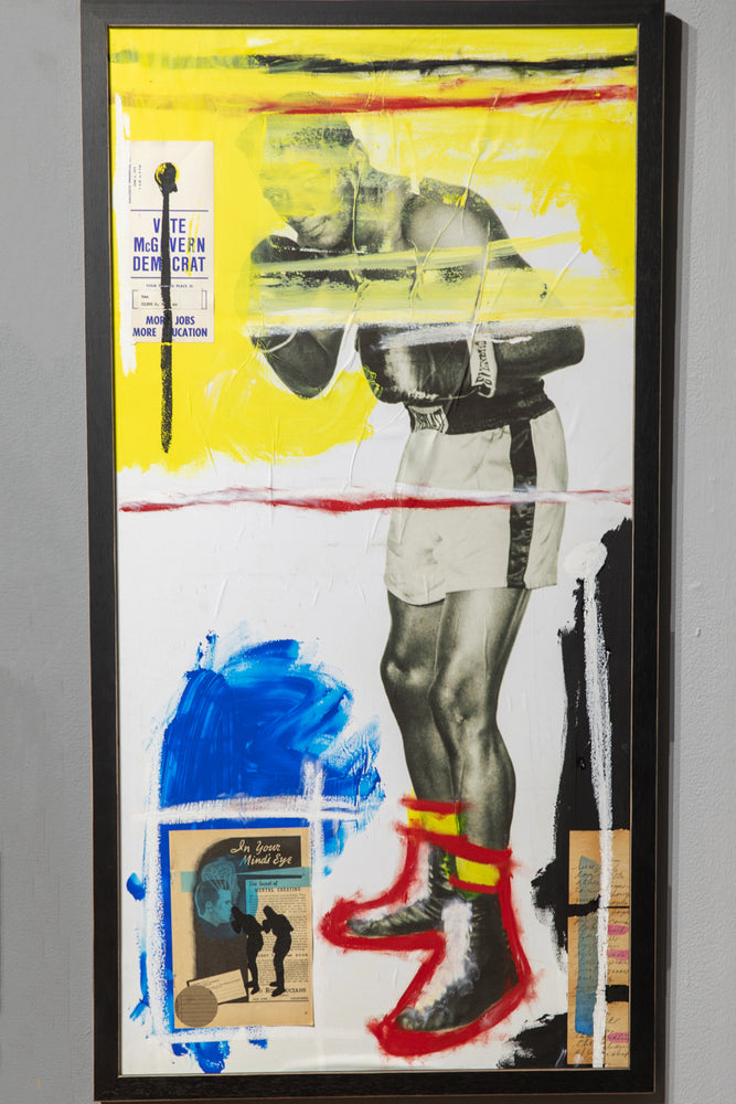 "Sometimes results arrive from things unplanned. Take for instance, stumbling across an original publicity still of two-time heavyweight boxing champion Floyd Patterson in the middle of a box of junk at a flea market in Southern California. I really can’t explain why some things Found speak to me so clearly. Floyd’s picture gets turned into a gel-transfer diptych on the backs of boards removed from a broken, hardbound book. But, for some reason, that’s not enough: a book needs to be assembled with Floyd’s image as the central motif. Still not enough: so, combine other found imagery, text, and items into this book in the same way Joseph Cornell did with his Manual of Marvels, turning a simple book into an object. This can’t be a one-off, either. A short run, limited to no more than something I could accomplish in a reasonable amount of time. Then, with forty hand-sewn into wraps, the only way to really make it right is to add a hardbound edition as well. Still not enough. Somehow, multiple paintings evolved directly from the Rauschenberg / Warhol / Berman sphere of influence using the same found elements in the books. Art from the book as opposed to a book coming from art. As many times as I could pull it off—which, in this case, was 5ive." - Jim Camp
