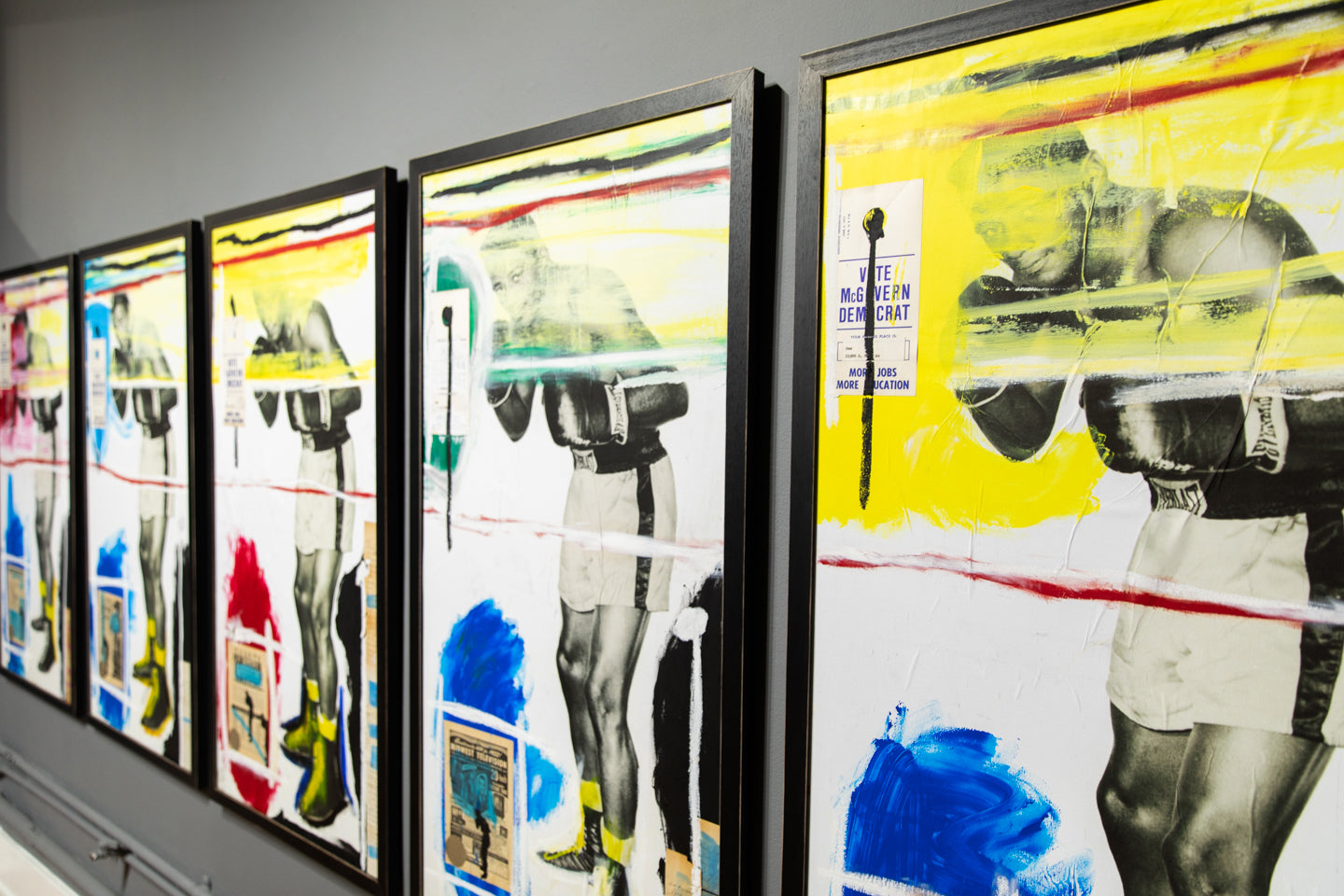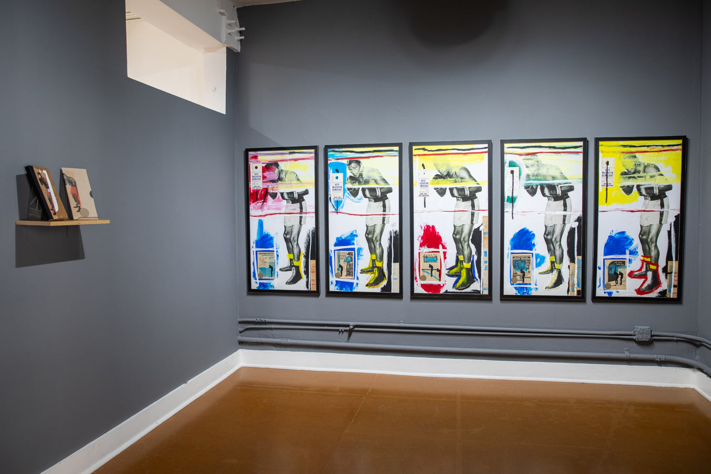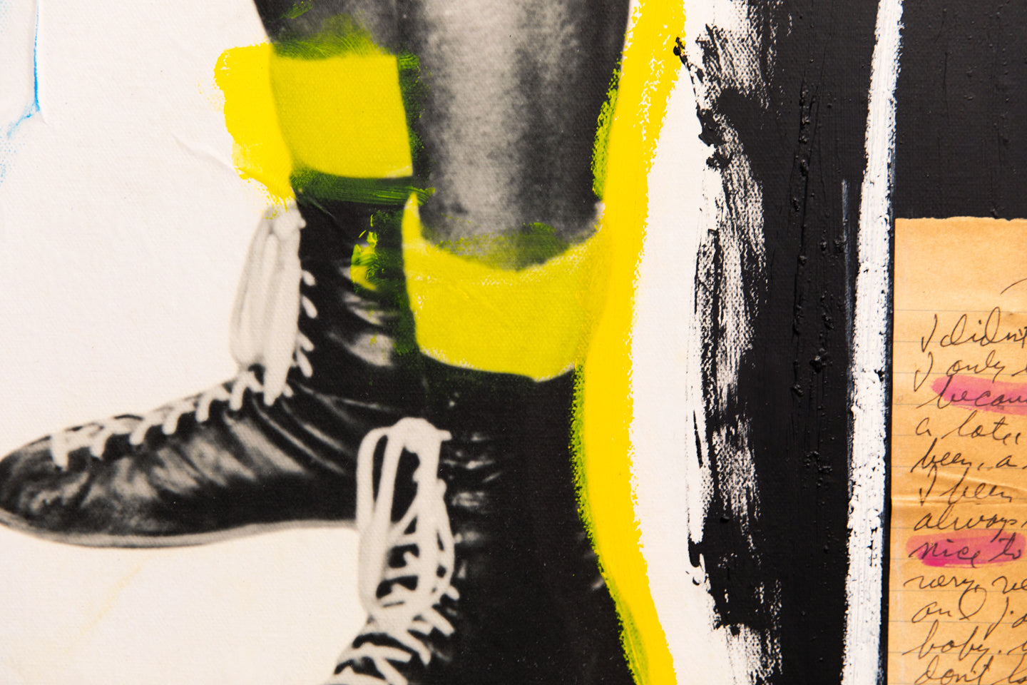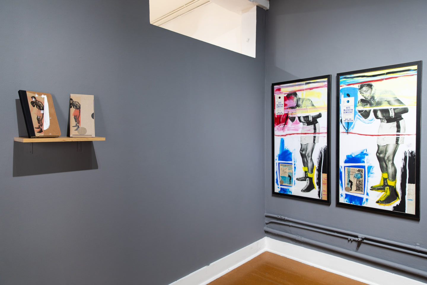 "Sometimes results arrive from things unplanned. Take for instance, stumbling across an original publicity still of two-time heavyweight boxing champion Floyd Patterson in the middle of a box of junk at a flea market in Southern California. I really can’t explain why some things Found speak to me so clearly. Floyd’s picture gets turned into a gel-transfer diptych on the backs of boards removed from a broken, hardbound book. But, for some reason, that’s not enough: a book needs to be assembled with Floyd’s image as the central motif. Still not enough: so, combine other found imagery, text, and items into this book in the same way Joseph Cornell did with his Manual of Marvels, turning a simple book into an object. This can’t be a one-off, either. A short run, limited to no more than something I could accomplish in a reasonable amount of time. Then, with forty hand-sewn into wraps, the only way to really make it right is to add a hardbound edition as well. Still not enough. Somehow, multiple paintings evolved directly from the Rauschenberg / Warhol / Berman sphere of influence using the same found elements in the books. Art from the book as opposed to a book coming from art. As many times as I could pull it off—which, in this case, was 5ive." - Jim Camp